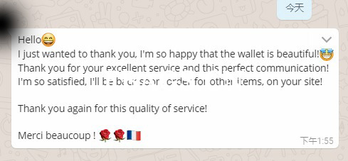 I received my wallet today thank you so much the quality is fantastic very happy with my purchase will order from you again soon